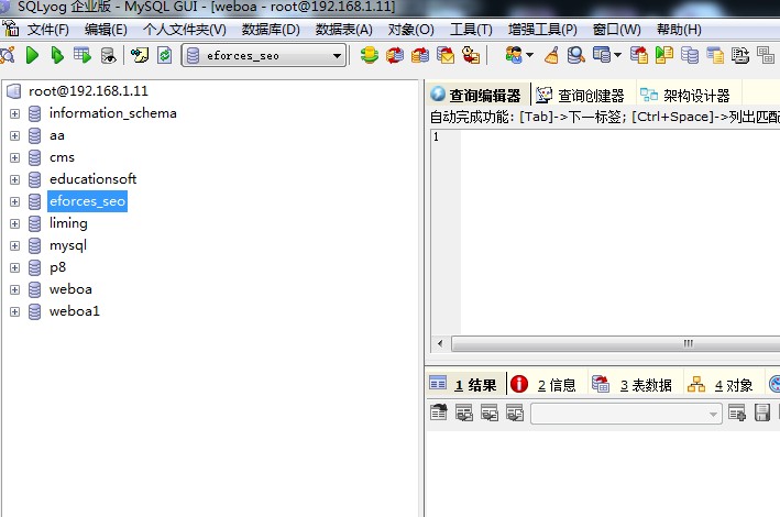 點(diǎn)擊root@******右鍵 創(chuàng)建數(shù)據(jù)庫(kù),數(shù)據(jù)庫(kù)名eforces_seo(任意填寫的)